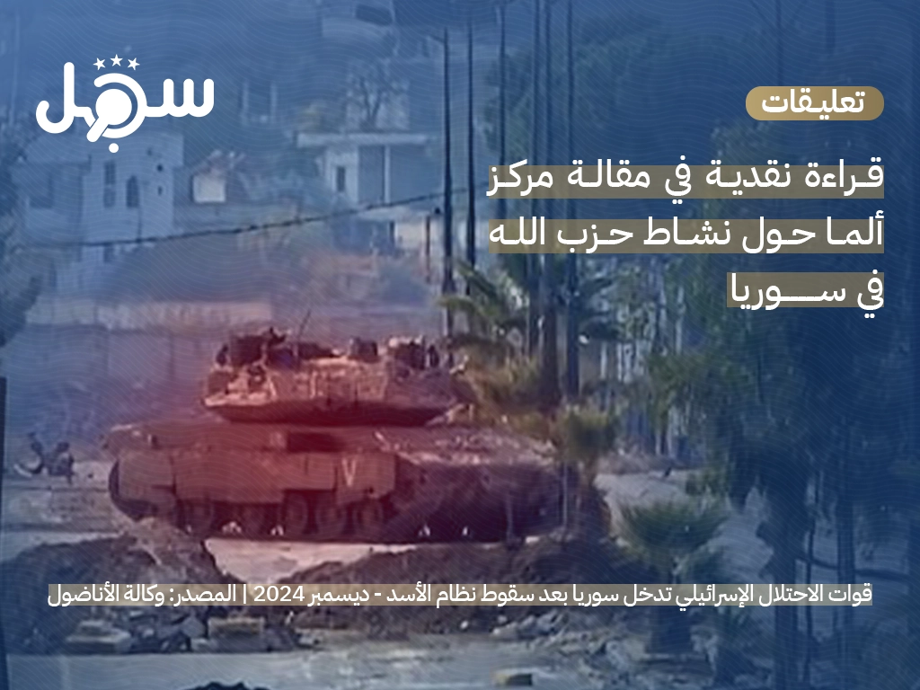 يعيد مركز ”ألما” في مطلع 2026 إنتاج ذات السردية التي طرحها في دراسته الموسعة في 15 أكتوبر 2025، والتي حللها ”مركز سجل” آنذاك. هذا الإصرار ينبع من جذور فكرية وأمنية محدّدة. في الدراسة السابقة أصرّ طال بيري (كاتب المقالة، وهو ضابط سابق في جهاز أمان) على استخدام تعبير ”البنية التحتية الإرهابية المحتملة الكامنة” (Potential/Dormant Infrastructure)، وهي لغة تهدف لترسيخ مفهوم ”العدو الموجود ولو لم يتحرّك”، مما يمنح شرعية دائمة للغارات الإسرائيلية والتوغّلات الحدودية حتى في غياب الأدلة الميدانية.