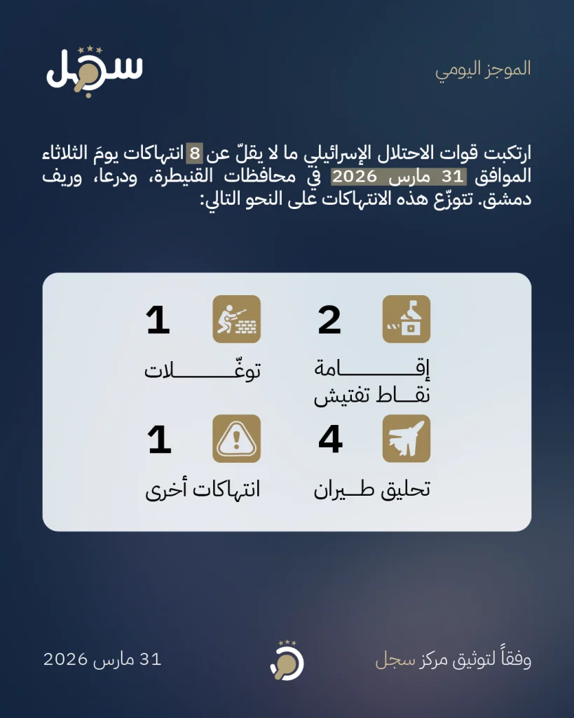 ارتكبت قوات الاحتلال الإسرائيلي ما لا يقلّ عن 8 انتهاكات يومَ الثلاثاء الموافق 31 مارس 2026 في محافظات القنيطرة، ودرعا، وريف دمشق، وفقاً لتوثيق مركز سجل. تتوزّع هذه الانتهاكات على النحو التالي:
