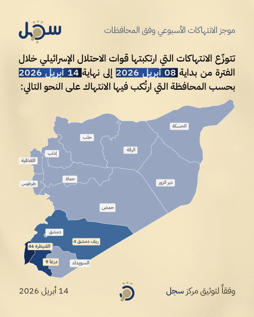 ارتكبت قوات الاحتلال الإسرائيلي ما لا يقلّ عن 59 انتهاكاً في محافظات القنيطرة، ودرعا، وريف دمشق خلال الفترة من بداية الأربعاء، 8 أبريل 2026، حتى نهاية الثلاثاء، 14 أبريل 2026، وفقاً لتوثيق مركز سجل. تتوزّع هذه الانتهاكات على النحو التالي: