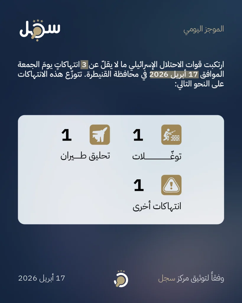 ارتكبت قوات الاحتلال الإسرائيلي ما لا يقلّ عن 3 انتهاكاتٍ يومَ الجمعة الموافق 17 أبريل 2026 في محافظة القنيطرة وفقاً لتوثيق مركز سجل. تتوزّع هذه الانتهاكات على النحو التالي: