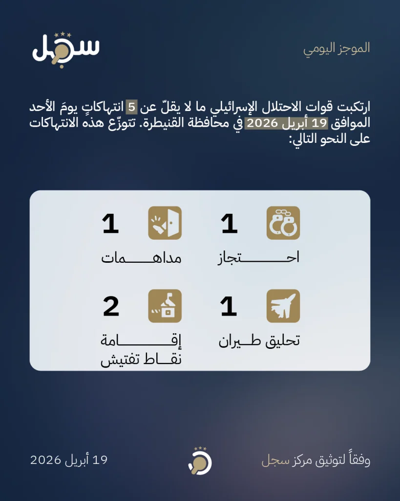 ارتكبت قوات الاحتلال الإسرائيلي ما لا يقلّ عن 5 انتهاكاتٍ يومَ الأحد الموافق 19 أبريل 2026 في محافظة القنيطرة وفقاً لتوثيق مركز سجل. تتوزّع هذه الانتهاكات على النحو التالي: