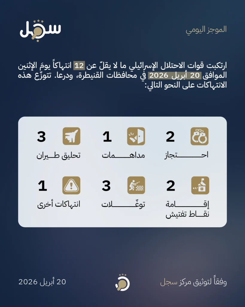 ارتكبت قوات الاحتلال الإسرائيلي ما لا يقلّ عن 12 انتهاكاً يومَ الإثنين الموافق 20 أبريل 2026 في محافظات القنيطرة، ودرعا وفقاً لتوثيق مركز سجل. تتوزّع هذه الانتهاكات على النحو التالي:
