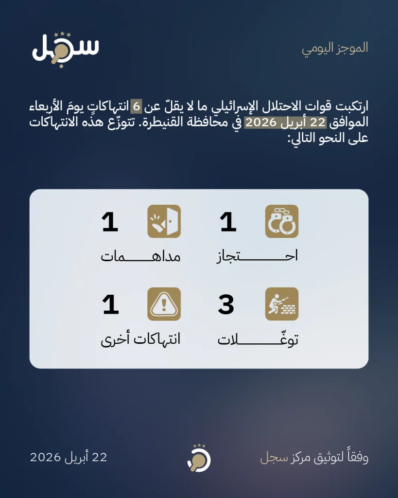 ارتكبت قوات الاحتلال الإسرائيلي ما لا يقلّ عن 6 انتهاكاتٍ يومَ الأربعاء الموافق 22 أبريل 2026 في محافظة القنيطرة وفقاً لتوثيق مركز سجل. تتوزّع هذه الانتهاكات على النحو التالي:
