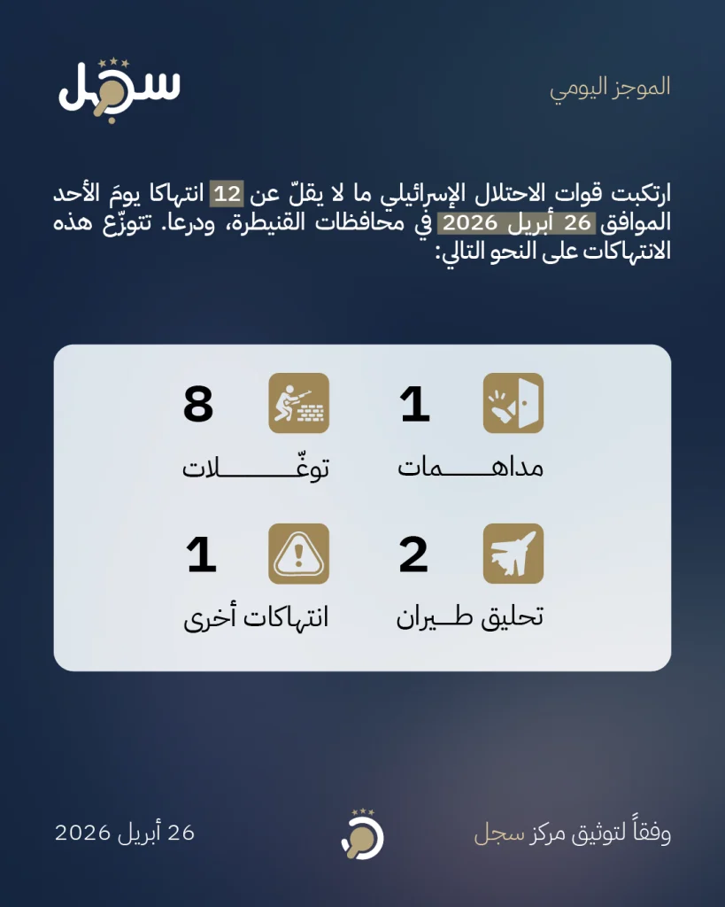 ارتكبت قوات الاحتلال الإسرائيلي ما لا يقلّ عن 12 انتهاكاً يومَ الأحد الموافق 26 أبريل 2026 في محافظات القنيطرة، ودرعا، وفقاً لتوثيق مركز سجل. تتوزّع هذه الانتهاكات على النحو التالي: