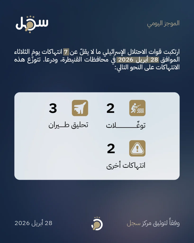 ارتكبت قوات الاحتلال الإسرائيلي ما لا يقلّ عن 7 انتهاكات يومَ الثلاثاء الموافق 28 أبريل 2026 في محافظات القنيطرة، ودرعا، وفقاً لتوثيق مركز سجل. تتوزّع هذه الانتهاكات على النحو التالي:
