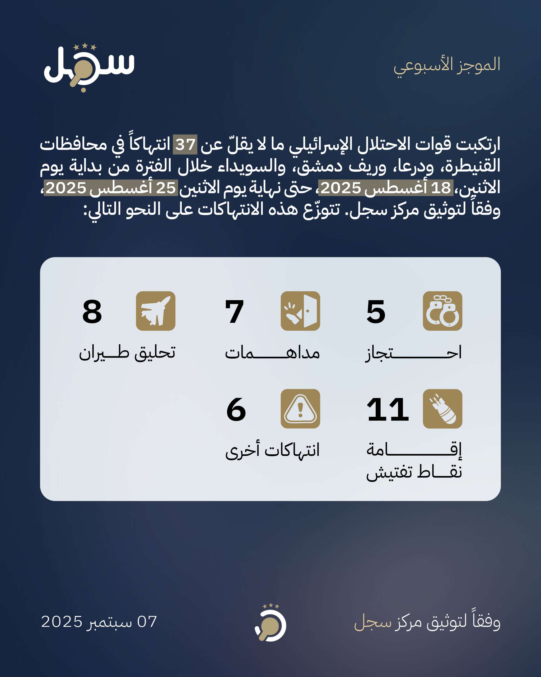 ارتكبت قوات الاحتلال الإسرائيلي ما لا يقلّ عن 37 انتهاكاً في محافظات القنيطرة ودرعا وريف دمشق والسويداء خلال الفترة من يوم الاثنين الموافق 18 أغسطس 2025 حتى نهاية يوم الاثنين الموافق 25 أغسطس 2025، وفقاً لتوثيق مركز سجل. تتوزّع هذه الانتهاكات على النحو التالي:
